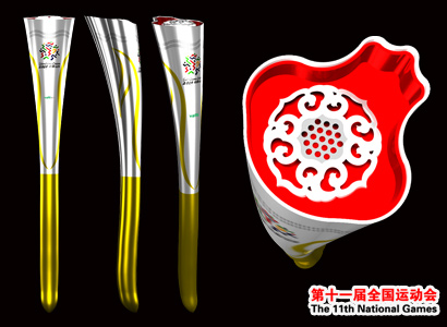 十一運會火炬“如意”緊緊圍繞“和諧中國、全民全運”的主題,外形由中國傳統(tǒng)吉祥物件“如意”演變而來,取“如意和諧,吉祥美好”之寓意;鹁嬲w由金銀兩色組成,出火口借鑒元代青花瓷荷花紋飾,殼體采用漢代柳葉紋飾裝飾,突出了濟南“四面荷花三面柳”的城市特色。