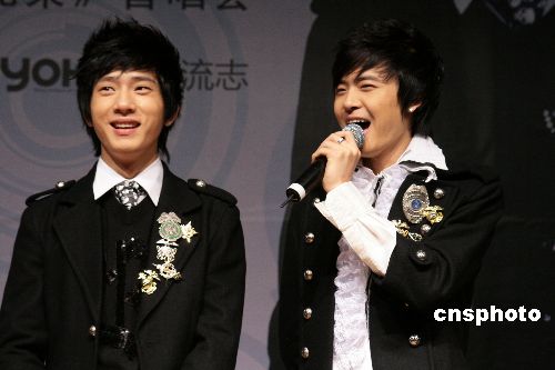 2007年10月22日,由“加油好男兒”的井柏然和付辛博組成的偶像團(tuán)體BOBO組合在北京舉辦了他們的首唱會。會上他們不僅載歌載舞與歌迷互動,還收到了大師兄羽泉組合送來的禮物。中新社發(fā) 一可 攝
