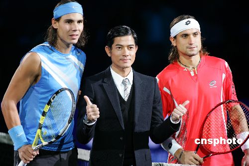 11月13日,香港藝人郭富城在上海“執(zhí)法”網(wǎng)球大師杯,為西班牙“德比”——拉斐爾·納達爾與大衛(wèi)·費雷兒的比賽“挑邊”。圖為郭富城(圖中)與納達爾(圖左)費雷兒(圖右)在賽場合影。中新社發(fā) 湯彥俊 攝