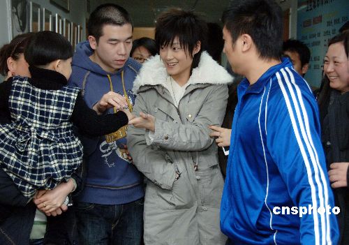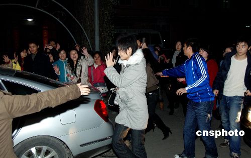 2007年12月16日晚,李宇春來到西安音樂臺(tái)接聽熱線,得到消息的百余名“玉米”蜂擁而至,爭(zhēng)相圍睹自己的偶像。中新社發(fā) 李海軍 攝