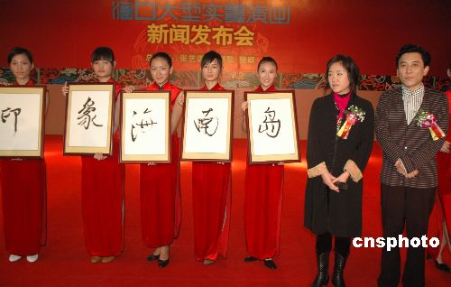 著名導(dǎo)演張藝謀執(zhí)導(dǎo)的?诖笮蛯(shí)景演出名稱一月二十一日在海南正式對(duì)外揭曉,“印象”系列再添新丁,《印象·海南島》成為張藝謀團(tuán)隊(duì)繼《印象·劉三姐》、《印象·麗江》、《印象·西湖》后的第四部作品。圖為張藝謀導(dǎo)演團(tuán)隊(duì)搭檔王潮歌(右二)和樊躍(右一)到?趨⒓用Q揭曉活動(dòng).中新社發(fā) 王辛莉 攝