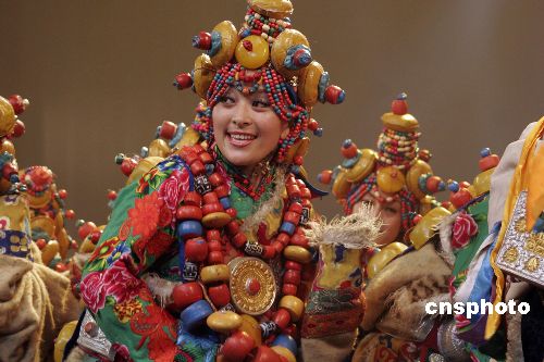2008年1月21日,著名舞蹈家楊麗萍攜《藏謎》在海口人民大會堂上演。《藏謎》以藏族老阿媽虔誠的朝拜路途中所見為主線,表現(xiàn)了藏區(qū)牧民生活、民間習(xí)俗、宗教儀式場景。主創(chuàng)人員用了1年多的時間,行走在藏、青、川、云等各省區(qū)的20多個藏區(qū),大量收集了音樂、舞蹈、器樂、服裝等作為原始創(chuàng)作素材。劇中8成以上的演員都是藏區(qū)的牧民,完全是原生態(tài)的演出。中新社發(fā) 尹恩彪 攝