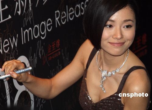 2月28日晚,香港紅星陳慧琳佩戴著價(jià)值千萬的珠寶,在北京舉行的香港“金至尊珠寶”2008新形象發(fā)布會上亮相。同時(shí)亮相的還有藝人張恒、唐嫣、高露、江一燕、丁柳元、陳虹池以及名模春曉等。中新社發(fā) 錢興強(qiáng) 攝