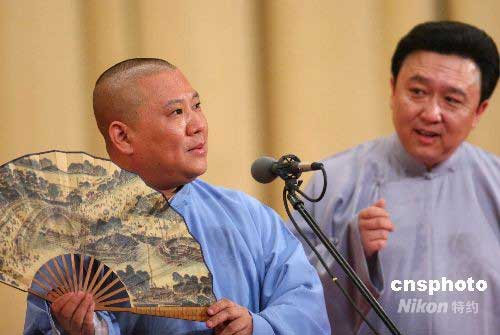 5月3日,紀(jì)念著名相聲大師侯寶林先生誕辰九十周年暨德云社相聲精品晚會(huì),在北京人民大會(huì)堂舉行,當(dāng)紅相聲演員郭德綱率領(lǐng)德云社成員侯震、于謙、何云偉、曹云金、李菁等為觀眾獻(xiàn)上了一場(chǎng)精彩的演出。全場(chǎng)所有段落都是在侯寶林先生原作的基礎(chǔ)上稍加修改而成,這其中包括了《賣布頭》、《戲曲與方言》、《歪批三國(guó)》等經(jīng)典段子。中新社發(fā) 富田 攝