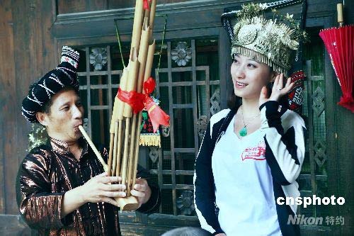 瑤族美女歌手米亮從奧運圣火回到祖國的那一刻起,就一路追隨著圣火的腳步,帶著未完成的作品《小夢想》,沿著圣火傳遞的路徑收集聲音和簽名,希望用一首萬人合唱的原創(chuàng)歌曲作為奧運獻禮。在到達江西老區(qū)境內時,正遇四川汶川縣發(fā)生強烈地震。于是,她毫無猶豫的加入到捐款的隊伍,并沿途收集了近千名兒童為災區(qū)小朋友親手制作的祝?ǎ缓笥盅赝巨D送給在各地治療的災區(qū)兒童。被稱為圣火傳遞中救災捐款的最美女孩。 2008年6月8日,米亮追逐圣火到達南寧,她首先做的一件事,就是到廣西區(qū)人民醫(yī)院看望災區(qū)受傷的兒童,并送上祝福卡。美女米亮,為南寧的景色所傾倒,禁不住換上民族服裝,在南寧留下美好印記。中新社發(fā) 駱文剛 攝