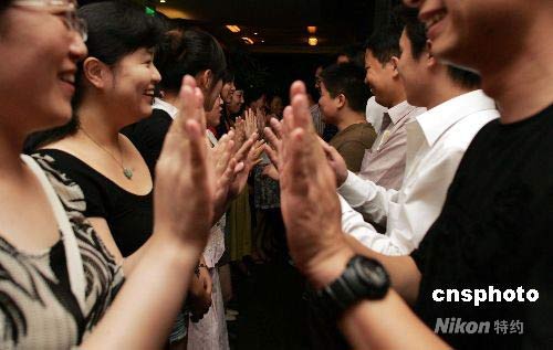 7月19日,眾多北京青年在集體相親會(huì)上拍手互動(dòng),在活動(dòng)中尋找自己的愛情。參加此次活動(dòng)的單身青年大多來自某婚戀網(wǎng)站,很多參加相親活動(dòng)的年輕人表示,對于自己理想伴侶的要求更多的是希望相互性格、志向、情趣相投。借助婚戀網(wǎng)站平臺線上線下活動(dòng)去尋找物質(zhì)生活和精神生活完美統(tǒng)一的伴侶。就像徐志摩的詩,“我將在茫茫人海中尋訪我唯一之靈魂伴侶。得之,我幸;不得,我命!币晃粎⒓踊顒(dòng)的年輕人笑談,如果徐志摩生活在當(dāng)下,一定也會(huì)通過婚戀網(wǎng)找到自己“唯一之靈魂伴侶”的。中新社發(fā) 楊可佳 攝