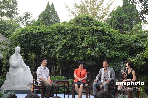 9月16日,《畫皮》主要演職人員周迅、陳坤、孫儷、戚玉武來到聊齋故里山東省淄博市淄川區(qū)蒲家莊,舉行《畫皮》全球首映式!懂嬈ぁ分黝}曲《畫心》的演唱者張靚穎也在現(xiàn)場傾情演繹了這一蕩氣回腸的歌曲。下午4點(diǎn),著名主持人崔永元和《電影傳奇》節(jié)目還專門在蒲松齡故居進(jìn)行了專訪,蒲學(xué)研究專家馬瑞芳現(xiàn)場進(jìn)行點(diǎn)評。淄博是歷史名著《聊齋志異》作者蒲松齡的故鄉(xiāng),《畫皮》是其代表作。經(jīng)過長達(dá)一年的籌備與拍攝,東方新魔幻巨制《畫皮》將于9月26日與全國觀眾見面。中新社發(fā) 閆盛霆 攝