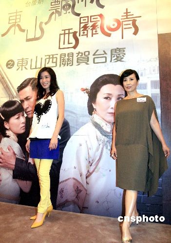 十月二十二日,香港無線電視為慶祝四十一周年臺慶,推出《東山飄雨西關(guān)晴》劇目宣傳。圖為該劇主要演員汪明荃(右)、佘詩曼出席慶;顒。中新社發(fā) 張勤 攝