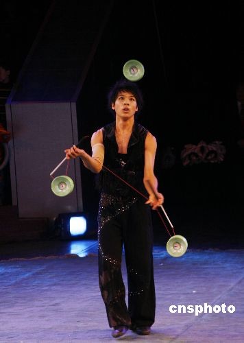 圖為來自中華臺(tái)北演員的表演《空竹》。第八屆中國武漢光谷國際雜技藝術(shù)10月25日在湖北武漢雜技廳開幕。本屆雜技節(jié)內(nèi)容包含雜技藝術(shù)的地面雜技、空中雜技、魔術(shù)、滑稽、馴獸五大類,可謂文武兼?zhèn)、精彩紛呈。中新社發(fā) 張 暢 攝