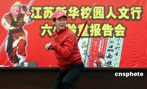 2008年11月14日下午,因扮演《西游記》中的孫悟空而聲名大噪的六小齡童(章金萊),帶著他的新書《六小齡童品西游》來到徐州賈汪中學(xué),與千名學(xué)生和教職員工一起品味西游文化。六小齡童通過自已17年來飾演孫悟空這一角色的感悟和獨(dú)有的情感,就猴的生物性、傳奇性、社會(huì)性、佛學(xué)性等西游文化與師生們進(jìn)行了交流。中新社發(fā) 雍君 攝