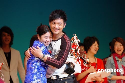 11月17日晚,第11屆日中卡拉OK大賽決賽在日本東京練馬文化中心舉行。這項(xiàng)連續(xù)舉辦了十一年的中國(guó)人唱日本歌、日本人唱中國(guó)歌的民間歌賽已漸成一知名品牌受到兩國(guó)文化愛好者的歡迎。因主演了創(chuàng)下臺(tái)灣票房奇跡的影片《海角七號(hào)》而炙手可熱的臺(tái)灣當(dāng)紅小生范逸臣此次作為特邀嘉賓出席大賽,不僅獻(xiàn)唱了三首代表作更親為獲得最優(yōu)秀獎(jiǎng)的選手頒獎(jiǎng)。圖為范逸臣為獲獎(jiǎng)選手頒獎(jiǎng)后與其擁抱祝賀。中新社發(fā) 朱沿華 攝