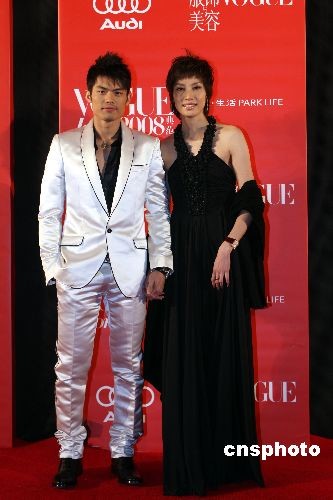 V0GUE2008年度盛典12月6日夜在北京銀泰中心舉行。羽壇“神雕俠侶”林丹、謝杏芳情侶檔高調(diào)亮相十指相扣走上紅毯秀甜蜜,林丹穿著休閑西裝搭配三顆扣子解開(kāi)的襯衣,謝杏芳也一改賽場(chǎng)上的樸實(shí),一身黑色露肩晚禮服,手拿精致小香包,女人味十足。林丹一路都非常體貼的輕挽著女友,兩人果真是金童玉女般的完美組合。中新社發(fā) 楊可佳 攝