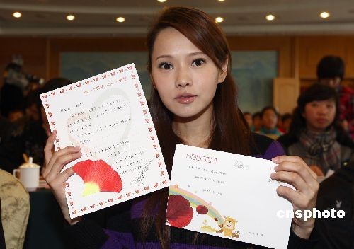 12月22日,愛心大使伊能靜在北京出席“新長城5·12災(zāi)區(qū)學(xué)生新春關(guān)愛行動”啟動儀式,并在愛心賀卡上親手為四川災(zāi)區(qū)小學(xué)生寫下新年祝福,這封賀卡將寄往映秀小學(xué)5年紀(jì)的賀華偉同學(xué)。參加活動的市民只需花費(fèi)10元人民幣,就可為災(zāi)區(qū)學(xué)生郵寄一枚新年愛心賀卡,其中還包含有為“自強(qiáng)獎學(xué)金”捐獻(xiàn)的善款。首批賀卡是寄給映秀小學(xué)學(xué)生的,他們將最先收到這份新年禮物。中新社發(fā) 杜洋 攝