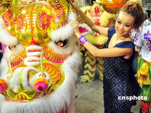 二月二日年初八,香港著名歌星容祖兒擔(dān)任時(shí)代廣場(chǎng)“金龍醒獅賀新歲”嘉賓,為六頭醒獅點(diǎn)睛及參花掛紅。中新社發(fā) 譚達(dá)明 攝