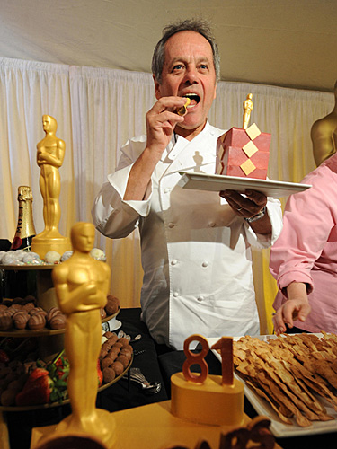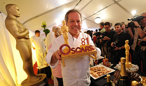 2月19日,負責(zé)奧斯卡州長舞會食品供應(yīng)的主廚沃爾夫?qū)て湛耍╓olfgang Puck)在美國加州好萊塢柯達劇場外的紅地毯上,向媒體展示即將于22日晚奧斯卡州長舞會的使用食品與裝飾。