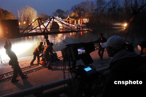 3月9日,新版《紅樓夢》劇組人員在揚州瘦西湖“熙春臺”景區(qū)進行試拍。當(dāng)日,由李少紅執(zhí)導(dǎo)的新版電視連續(xù)劇《紅樓夢》在揚州瘦西湖景區(qū)取景。中新社發(fā) 范友林 攝