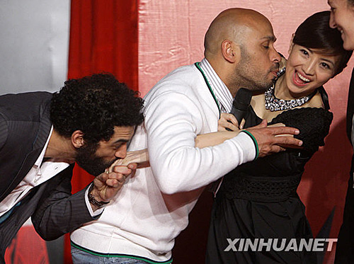 4月9日,法國電影《孤獨二兄弟》的導(dǎo)演兼主演、法國家喻戶曉的笑星組合朗茲·貝迪亞(左)和埃里克·朱多爾(中)在接受采訪時逗樂。當(dāng)日,由中國國家廣播電影電視總局、法國駐華大使館等單位共同主辦的“2009中法文化交流之春暨第六屆法國電影展映活動”在北京開幕,該活動將向中國觀眾展現(xiàn)當(dāng)代法國藝術(shù)舞臺的活力和創(chuàng)造力,為中法兩國藝術(shù)家提供交流的機(jī)會。邢廣利 攝