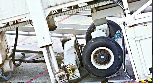 空橋支柱與輪子間銜接處斷裂,初步排除保養(yǎng)維修不足釀禍。圖片來(lái)源:臺(tái)灣蘋(píng)果日?qǐng)?bào)