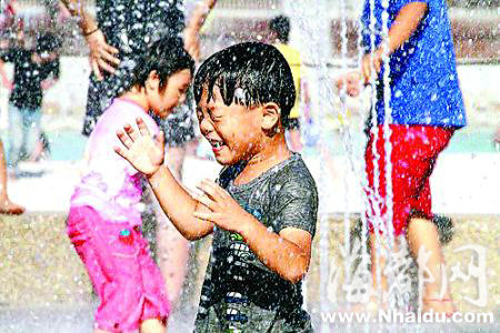 。天氣太熱,很多人選擇到溪河里泡水解暑,有的到大百貨商店吹冷氣,孩子們則選擇了到廣場的噴水池嬉水。動物們也熱得受不了,動物園給猴子們準(zhǔn)備了冰塊降溫,外出的狗狗們則被戴上了太陽鏡,遮擋熾熱的陽光。