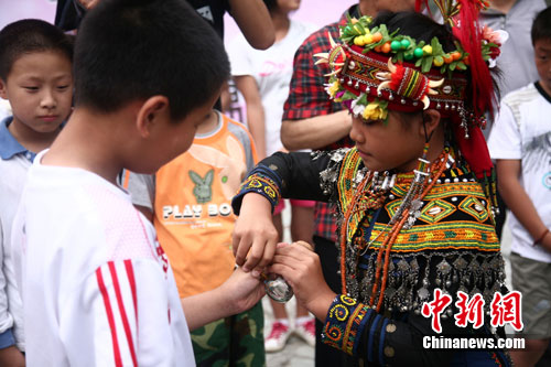 記者在現(xiàn)場(chǎng)看到,來自臺(tái)灣阿里山鄉(xiāng)達(dá)邦國(guó)小和屏東縣泰武國(guó)小的28名小朋友,為遭受“5.12”地震的北川羌族民眾戴上平安珠手鏈。來自臺(tái)灣屏東縣三地門鄉(xiāng)的王蕓說,希望平安珠能保四川災(zāi)區(qū)羌族人民平安。北川羌族民眾為參訪團(tuán)代表敬獻(xiàn)了羌紅,將平安送給臺(tái)灣“8.8”風(fēng)災(zāi)少數(shù)民族人民。