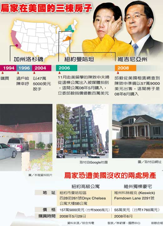 依美方資料,扁家在紐約市近曼哈坦八大道鬧區(qū)的豪華公寓,售價(jià)一百五十七萬五千美元(約臺幣五千萬元),在○八年五月二十九日購買;在弗州要價(jià)五十五萬美元(約臺幣一千七百六十萬元)的獨(dú)棟住宅,在同年六月購得。