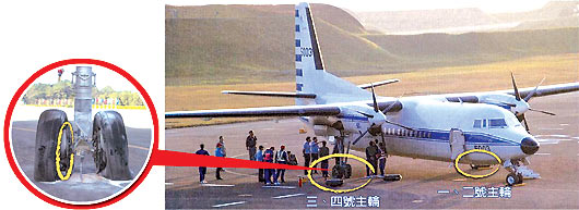 2009/11/01 FK-5003執(zhí)行馬英九座機任務(wù),在臺中清泉崗基地落地后滑行,右主輪煞車盤過熱,導(dǎo)致來令片及輪胎損傷熱熔并冒煙起火。