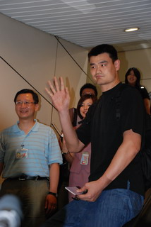 據(jù)報道,來臺灣參加慈善活動的美國職籃火箭隊當家中鋒姚明,26日下午搭乘華航班機來臺,立刻受到大家熱烈包圍,桃園縣長吳志揚前往機場接機,贈送桃園縣農特產品給姚明,希望在臺灣期間可以好好品嘗一下,姚明也回贈這次活動一件球衣給吳縣長。
