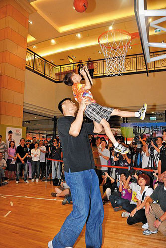 高縣鳳甲初中籃球隊張姓學(xué)生向姚明請教如何帶球過人,姚明謙虛表示:“我打中鋒不懂過人,只會把人撞開,同學(xué)動作比我厲害多了!”他并打趣地要張同學(xué)教他過人技巧。