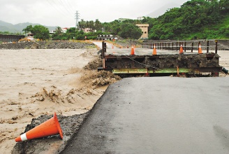 昨天上午10時(shí)許,六龜鄉(xiāng)六龜大橋旁的便橋因支撐不住暴漲荖濃溪水沖刷,中間一截應(yīng)聲斷裂,工務(wù)段緊急管制封閉;新開部落聯(lián)外的新寶橋旁便橋也同樣遭荖濃溪水沖毀,百余戶新開部落居民無法外出,臺(tái)軍士兵昨天一度冒雨搶通便道。