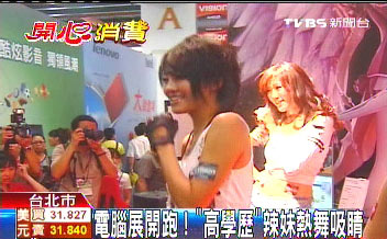 據(jù)臺灣TVBS電視臺報道,臺北計算機(jī)展大會舞臺還沒開鑼,參展廠商就派巧克力膚色辣妹開始搏版面,沒有舞臺就在展場地毯展現(xiàn)動感。有的廠商由于和隔壁搞競爭搶眼球,上午11點(diǎn)半的Show Gilr表演,足足提早1小時。