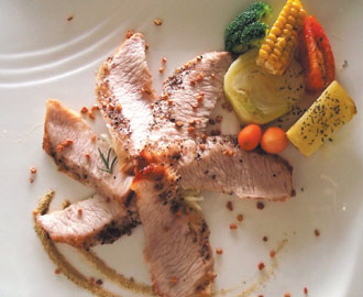 洪蘇翠娟表示,煎烤松阪豬肉以高溫起鍋煎烤,見到豬肉外表金黃色澤,便可撈起細(xì)切;餐盤上佐以玉米、馬鈴薯、小番茄等時(shí)令蔬果,灑上芝麻顆;蚝返,就是誘人美食。