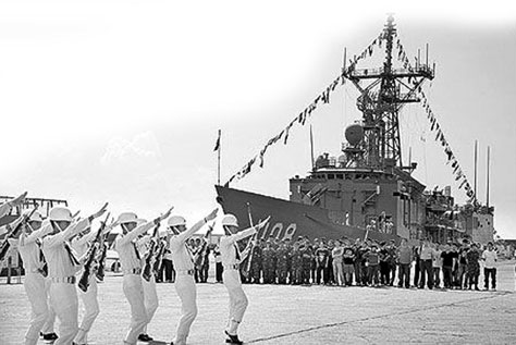 臺軍中年頭最久的傳統(tǒng)莫過于“海龍王大典”。據(jù)臺媒報道,臺海軍的敦睦遠航支隊每年要穿越赤道一次,所有艦艇一字排開,橫著穿過赤道。同時艦艇上的汽笛拉響一分鐘,艦尾則噴水柱以示慶祝。除值班官兵外,所有人都要到甲板集合,舉行 “海龍王大典”。儀式由支隊長或艦長主持,他們帶頭焚香禱告并獻上牲果祭拜,祈求上天保佑航行平安。接著,甲板上會出現(xiàn)由海軍官校學(xué)生扮演的“海龍王” 和“蝦兵蟹將”。他們身穿龍王服、手持龍王杖、頭戴龍王面具,煞有介事地“出巡”,隨后向全艦官兵宣讀“圣旨”,同意艦艇通過赤道線!昂}埻酢边會頒發(fā)“過赤道證書”,由艦長恭敬接過。