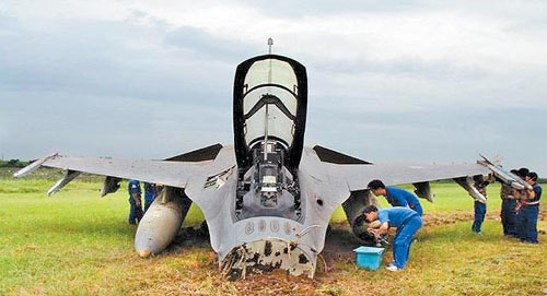 當年6月26日機號6812的F-16B型雙座機,由嘉義聯(lián)隊莊姓分隊長駕駛,后座載著“國防部”整評室副主任陳姓少將,進行戰(zhàn)術(shù)攔截課目的熟飛,降落時,未注意跑道積水,致使戰(zhàn)機落地時,飛行員施放阻力傘后戰(zhàn)機嚴重右偏,雖然隨即拋棄阻力傘,立即使用方向舵及煞車改正偏右狀況仍無效,戰(zhàn)機降落跑道上行進約一公里后沖向草坪,機身嚴重受損;經(jīng)評估修復戰(zhàn)機,不包括發(fā)動機的修復即要花800多萬元新臺幣。