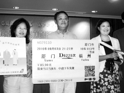 “11年前我就是搭第一班‘小三通’輪船去福州,今天(9月3日)又在臺灣買到了第一張動車火車票,真是感慨萬分。我上次回福州還要自己在廈門排隊買車票,這次就不用了,真是太方便啦。”3日上午,福州臺商張鳴齡先生興奮地從臺灣三菱旅行社總經(jīng)理周惠全手里接過車票模型,宣告大陸動車車票在臺灣正式開賣。