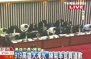 中新網(wǎng)9月28日電 據(jù)臺灣TVBS報(bào)道,針對919“凡亞比”臺風(fēng)造成高雄市大淹水,市長陳菊連日來遭到相當(dāng)多的指控,今日,在市議會總質(zhì)詢時(shí),陳菊特別率領(lǐng)市府官員向市民道歉。