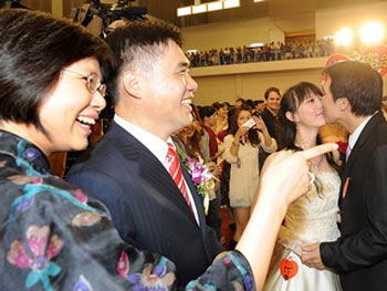 中新網(wǎng)10月11日電 據(jù)臺(tái)灣“今日新聞網(wǎng)”報(bào)道,臺(tái)北市政府10日下午舉行“花現(xiàn)臺(tái)北2010聯(lián)合婚禮”,臺(tái)北市長郝龍斌與夫人高閬仙現(xiàn)身為140對(duì)新人證婚,并祝福新人“幸福久久、十全十美、雙雙對(duì)對(duì)、萬年富貴”。