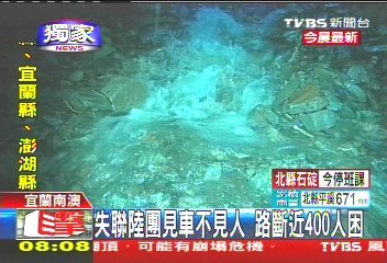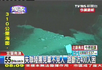 中新網(wǎng)10月22日電 據(jù)臺灣TVBS報(bào)道,宜蘭大淹水,蘇花公路更是處處坍方,甚至傳出有大陸游客團(tuán)的游覽車受困。該媒體記者挺進(jìn)現(xiàn)場,只看到游覽車空車,人員不知去向,不知是否平安;臺九線大約115公里處,部分路段的路基完全被淘空,土石滑落一兩百米的山下,附近路面更變成小溪、不斷淹水。