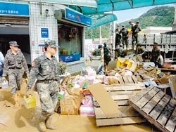 昨天一早大水消退后,蘇澳民眾在四千多名臺(tái)軍協(xié)助下,展開清理家園工作。蘇澳主要道路中山路上原本是雙線道,但因?yàn)?zāi)民將家中受損的家具、沙發(fā),全部搬到大馬路暫時(shí)堆置,整個(gè)蘇澳市彷佛就像大型垃圾場般紊亂,加上軍用卡車、垃圾車、推土機(jī)不斷來回,過往交通一度受阻。