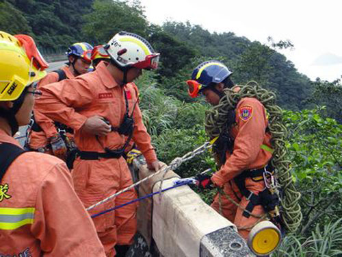 歷經(jīng)40分鐘路程,來到116公里處,前方已一大片塌方,無法再向前。不到片刻,一群身穿橘衣、步伐整齊的臺北市搜救隊(duì)朝這走來。在短暫的集合、下達(dá)指令后,搜救隊(duì)員系著繩索,一個接著一個從路邊護(hù)欄緩緩垂降,搜索生還者及車輛殘骸。