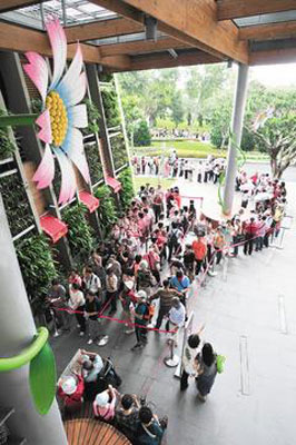 另外,針對夢想館、養(yǎng)生館、真相館、名人館、故事館等5個展館,花博總部采發(fā)放預約券入館,從早上9點開始一次發(fā)放,發(fā)完為止;其中最熱門的夢想館,每日發(fā)放四千張預約券,25日上午到11時左右則發(fā)了兩千多張,并未如預期“暢銷”;而之前同樣熱門的“夢想劇場”,因不發(fā)放預約券,采用現(xiàn)場排隊,場外則是大排長龍。