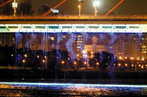 最適合夜間欣賞的大佳展區(qū),25日夜飄起毛毛雨,但號(hào)稱亞洲最大的戶外數(shù)位水幕未受影響。各式花博文字、圖形隨一波波水幕傾瀉而下,基隆河岸長(zhǎng)1250米的堤壁更可見夜光黑面琵鷺、油桐花閃閃發(fā)光,民眾都撐傘、穿起雨衣在河畔靜靜瀏覽河景。
