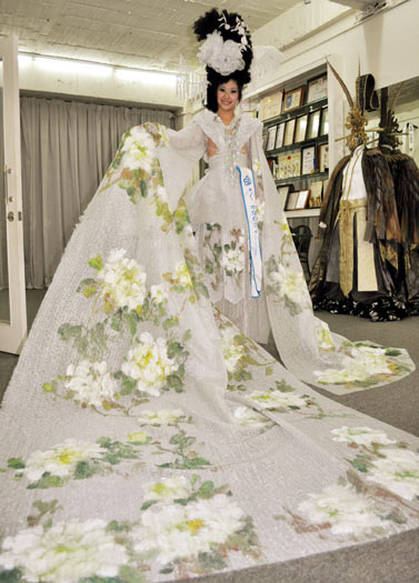 2010全球生態(tài)旅游小姐決賽24日在南京舉行,數(shù)十名佳麗參賽,臺(tái)灣實(shí)踐大學(xué)服裝設(shè)計(jì)系學(xué)生林育如,身著一襲以臺(tái)北花博萬華區(qū)區(qū)花白牡丹為意象設(shè)計(jì)的服裝參賽,驚艷全場,拿下最佳生態(tài)旅游小姐獎(jiǎng),林育如26日載譽(yù)返臺(tái),在高雄家鄉(xiāng)展示參賽服裝。