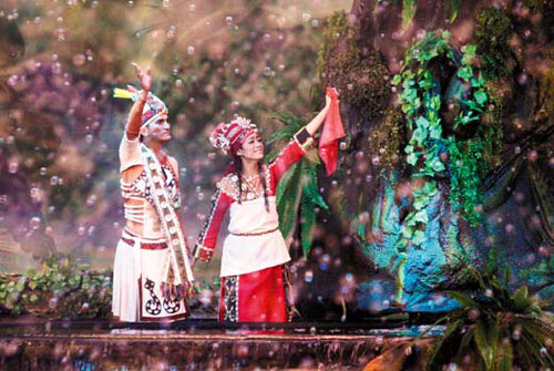 《百合戀》由屏風表演班及少數(shù)民族舞者制作、主演,劇情融合魯凱族親情、愛情,以及人與土地之情,水舞臺有潺潺水瀑,透過9座600公斤油壓臺及像“烤肉架”的鐵網(wǎng)設(shè)計,可瞬間切換涌出水來,變成一池寬10米、深9米的湖水,搭配漫天泡沫及魯凱語歌聲回蕩,仿佛置身山谷間。