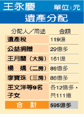 王永慶身后在臺(tái)灣留下595億元的遺產(chǎn),大房王月蘭原本可分到其中一半297億元。但根據(jù)王家人的協(xié)議,王月蘭將把分到的一半遺產(chǎn)均分給二房楊嬌和三房李寶珠,兩人各得74億多元;至于剩下的一半遺產(chǎn)在繳稅和捐贈(zèng)后,由王永慶的三個(gè)妻子和九個(gè)子女均分,每人可得12億多元。