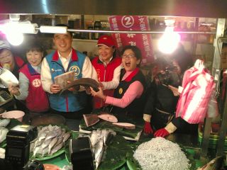 郝龍斌今早來到臺(tái)北市文山區(qū)傳統(tǒng)市場——木新市場拜票,他到市場與每一位攤商、民眾握手,由于文山區(qū)是藍(lán)營的傳統(tǒng)票倉,現(xiàn)場當(dāng)選聲不斷,甚至郝龍斌還拿起魚貨,幫攤商叫賣。