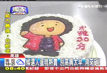 甜點師傅說,這些蛋糕全都客制化服務,要支持還是發(fā)泄,全都可以依照顧客喜好來更改,比起一般的蛋糕,這些砸派比較便宜,8吋300元,還能邊砸邊吃,不過最近賣最好的就是楊淑君的蛋糕,至于候選人公仔蛋糕,訂單也不少,一個禮拜至少也有3到4顆,看來從蛋糕銷售量,真的也能反映時事。