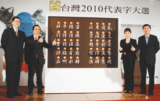 她指出,今年候選的40個(gè)代表字多具祥和的正面力量,但“亂”字依然連續(xù)三年入圍。她透露,遠(yuǎn)東集團(tuán)董事長(zhǎng)徐旭東選的代表字是“新”字,理由包括:ECFA創(chuàng)造“新”契機(jī)、“新”市場(chǎng)、花博展現(xiàn)的華人力量讓全世界耳目一“新”、“五都”選舉將展現(xiàn)“新”面貌等。黃晴雯自己則選“愛”字。