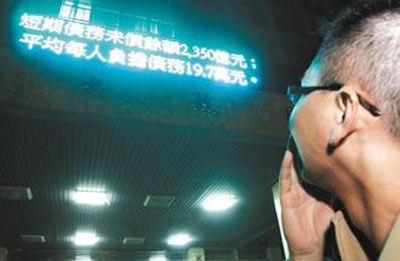 據(jù)報道,7日傍晚近7時,“財政部”財政大樓正門和側(cè)門的電子看板上,以跑馬燈方式秀出“截至2010年11月底,‘中央政府’一年以上債務未償余額4.32818兆元(新臺幣,下同),短期債務未償余額2350億元;平均每人負擔債務19.7萬元”,以電子看板的形態(tài)仿效美國設置“債務鐘”。