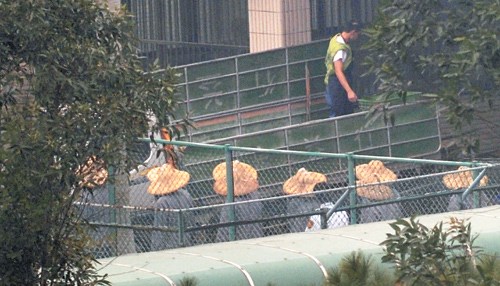 上周五,“斗笠隊(duì)”出現(xiàn),民眾只是奇怪;昨天,北監(jiān)再次出現(xiàn)一排戴著斗笠的受刑人,成一字縱隊(duì)陪阿扁走出舍房,沿途所經(jīng),還加上綠色帆布阻隔,只見(jiàn)上下是一張張斗笠和一只只腳快速移動(dòng),中間是綠色帆布,場(chǎng)景有如日本“忍者”。