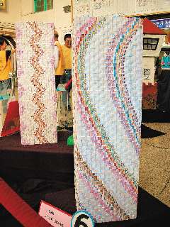 據(jù)美國(guó)《世界日?qǐng)?bào)》報(bào)道,現(xiàn)場(chǎng)展出10件作品,都是以發(fā)票箱為主體,并在箱子外拼貼數(shù)百?gòu)埌l(fā)票,成為獨(dú)特的造型。最引人注目的作品是當(dāng)?shù)嘏痈唔嵎业膭?chuàng)作。她仔細(xì)研究各店家的發(fā)票,并依不同的顏色排列成特殊花紋,作成大型燈罩。